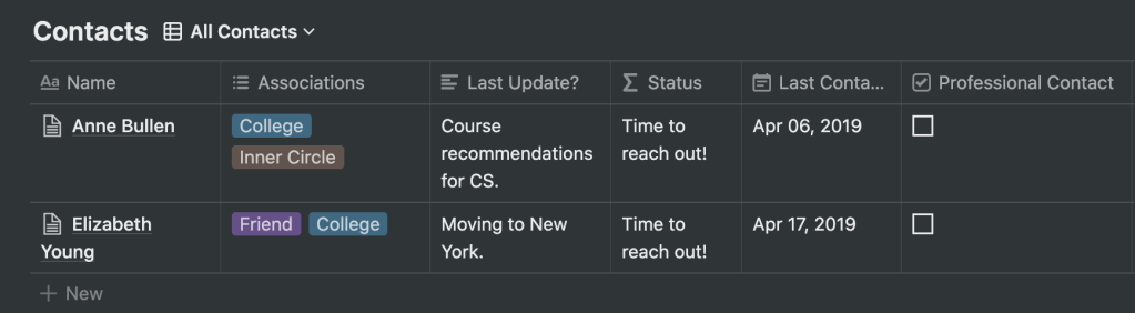 By positioning myself to build my own ‘digital book of contacts’ and having a visible status that would automate a reminder whenever I need to reach out – I can make the necessary effort and not rely on a chance meeting. Overall, this is an initial draft template that would see a whole lot of changes as ‘my contact list’ expands. If you guys decide to pursue your personal CRM, I recommend checking out the posts from Khe Hy and Nat Eliason.